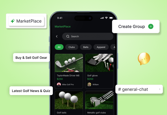 The platform includes a dedicated marketplace where members can buy and sell golf equipment, making it easier to find quality gear while ensuring secure transactions and trusted community interactions.